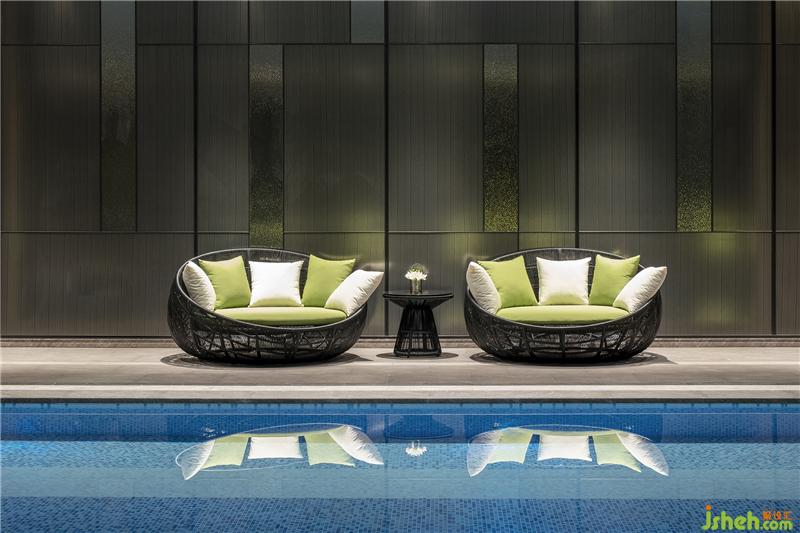 兩邊的夾絲玻璃與水紋鏡墻面再次強(qiáng)化了植物墻的視覺主題。淡藍(lán)色天花板采用光纖燈勾勒出宛如銀河的圖案,與水面的倒影交相輝映,讓整個泳池宛如夢幻。徜徉于唯美的泳池里,邂逅粼粼波光、盈盈光芒,感受設(shè)計師描繪出的那份自然與浪漫的情懷。