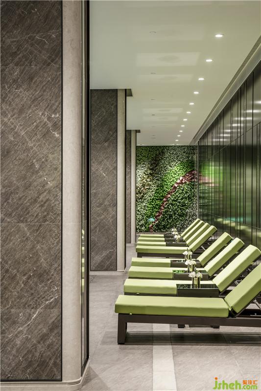 每一處細(xì)節(jié)的悉心考究,模糊了室內(nèi)外的界限。泳池盡頭是一整片植物墻,淺青、深綠、紅棕……不同植物構(gòu)成一條條斑斕的色帶,層次分明又渾然一體,不僅具備強(qiáng)烈的視覺沖擊感,也渲染出了十足的自然氣息。