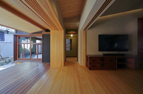造型部分形成了一個水平擴(kuò)展的單一空間,其中“Hiraki Do”門基于Shoin風(fēng)格的“Tukeshoin”設(shè)計,可以分割并打開整個房間,而無需永久分隔。單個空間可以被這些巨大的平門隔開,產(chǎn)生模糊的私密性和開放性。