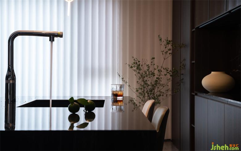 既是聚合空間,材質(zhì)的呼應(yīng)尤為重要,西廚的巖板與頂面的木皮在立面與頂面都與客廳背景部分進行了呼應(yīng)和連貫。