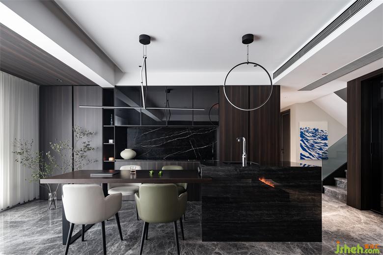 The design of the horizontal hall makes the interaction of the space better and the sense of scale wider. The oversized floor glass windows allow sufficient light to shine in. The western kitchen cooking area, the island platform and the dining table are arranged in parallel. The layout is convenient and practical. The good interaction with the living room enriches the laughter of family life