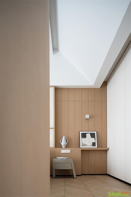 套房區(qū)域在色調(diào)方面做了些許調(diào)整,整個空間以原木色為基調(diào),別墅設計營造溫馨舒適的睡眠環(huán)境,在保留原有建筑頂面結構的基礎上做了異形的吊頂設計,休閑自然的布局思路是這個空間的定位,不過分的追求功能性,家具與飾品散落在各個角落亦能烘托出隨意居家的氛圍。