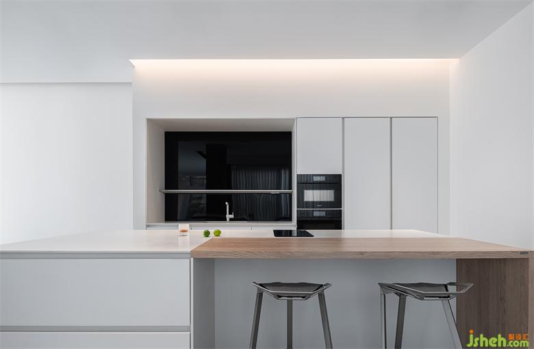 西廚與島臺間做了縱向聯(lián)通,色調(diào)上統(tǒng)一為了白色黑色,大氣時尚 。