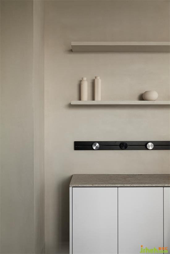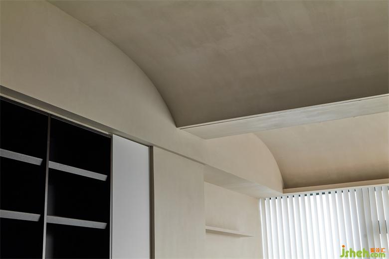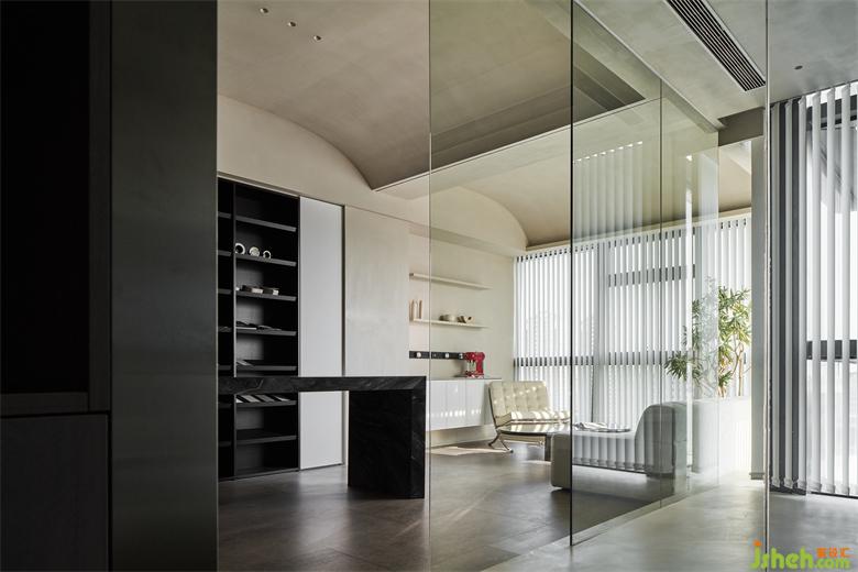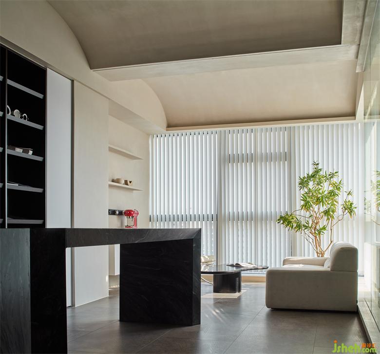 原始建筑有較寬大的立柱與橫梁,因此由門廳過渡到休息區(qū)的空間流暢度便尤為重要,我們把橫梁的兩側(cè)分別作為兩個圓弧的起點與終點,自然優(yōu)雅的在窗簾盡頭完成排布,而通體的微水泥包裹則把空間的一致性與流暢性完美結(jié)合。