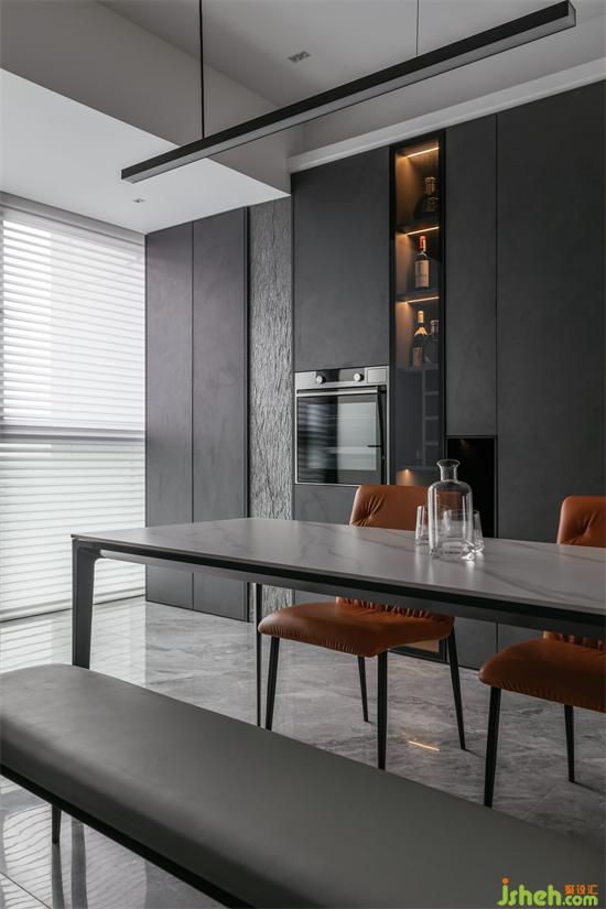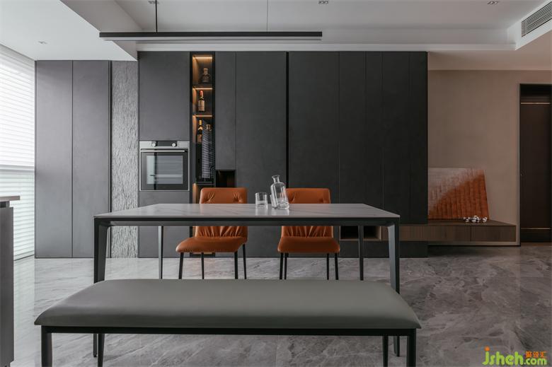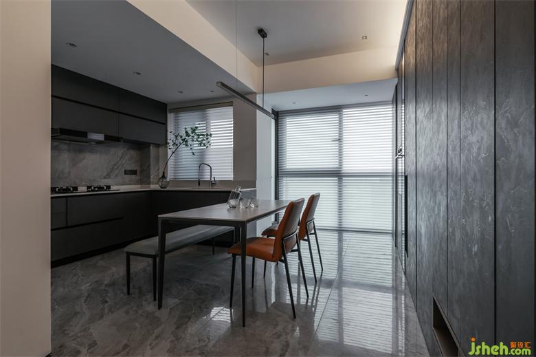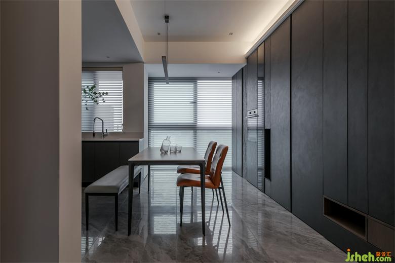 冷靜是空間的設(shè)計基調(diào),由餐廚區(qū)域的深色到過道的木色過度直到客廳的咖色,家裝設(shè)計剛中有柔,質(zhì)感滿滿。