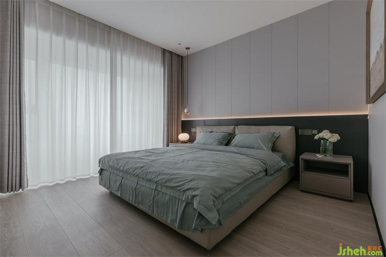 溫暖放松的睡眠環(huán)境是這個(gè)臥室空間的設(shè)計(jì)思路,溫潤的地板,家裝設(shè)計(jì)柔和的硬包甚至相同色系的油畫都在契合這個(gè)主旋律。