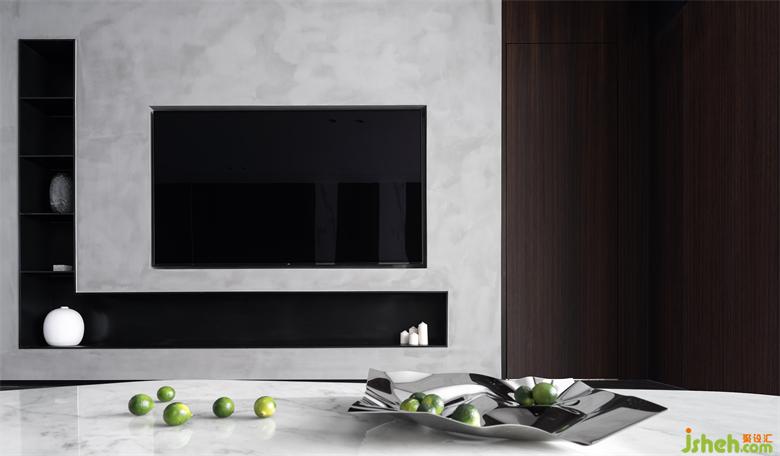 清水混凝土質(zhì)感的藝術(shù)漆勾勒出電視墻的大致線條,完全內(nèi)嵌的電視機與不銹鋼超薄開放層板營造出簡約的處理手法。