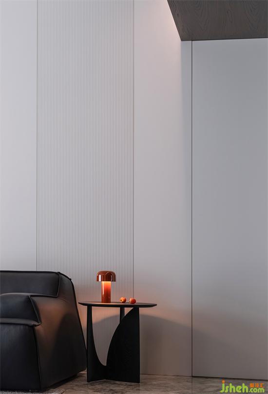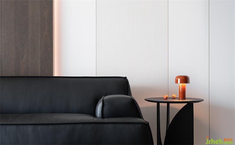 Break the boundary, break less and stand more. Clear color blocks organically classify the space. The wood veneer running through the top wall divides two activity spaces. The background of the living room uses oil mixed sealing strips and solid color invisible doors to neutralize the intensity of the wood veneer. The transition to the sofa background uses half height wood veneer to echo the general tone. The two rounded corners of the TV wall and the porch are naturally harmonious, and the contrast of colors also collides with the modern atmosphere.