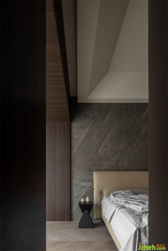 建筑原有的尖頂結(jié)構(gòu)使得室內(nèi)的吊頂更加多元化,在保留盡可能的高度同時(shí),做了梯形向上的設(shè)計(jì)。景瑞無(wú)雙別墅設(shè)計(jì)保留了空間的縱深感也增加的形態(tài)的多樣性。