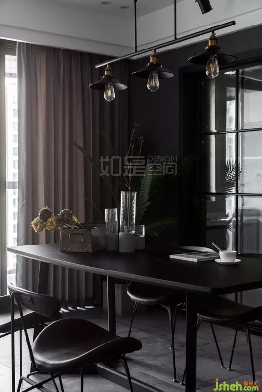 餐桌采用棕黑色木面,搭配螞蟻凳,加上黑色鐵藝、復(fù)古吊燈,形成工業(yè)風(fēng)的獨(dú)具氣質(zhì)