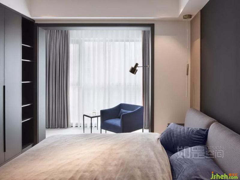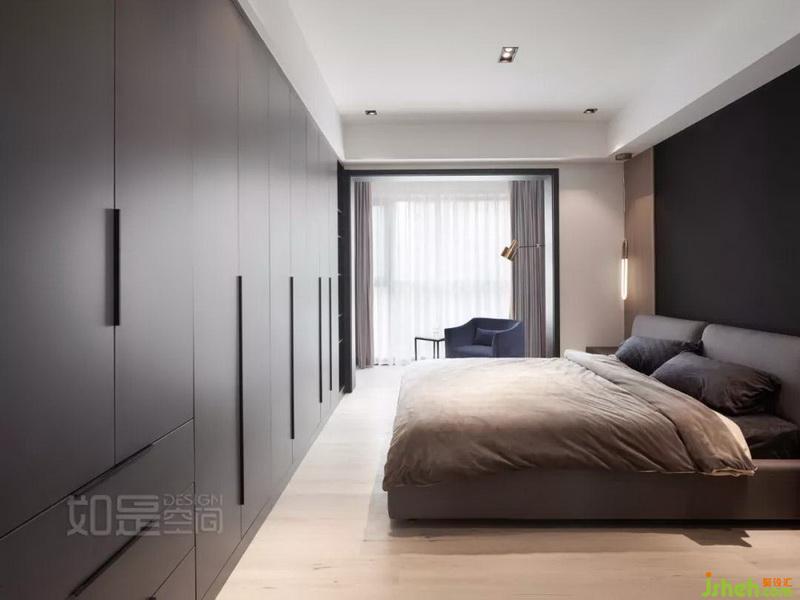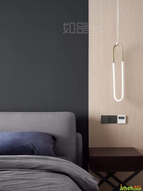 主臥的墻面背景室內(nèi)設(shè)計(jì)師選用了暗色系,床體的灰色靠背則在背景的黑色和木色之間起了很好的調(diào)和。