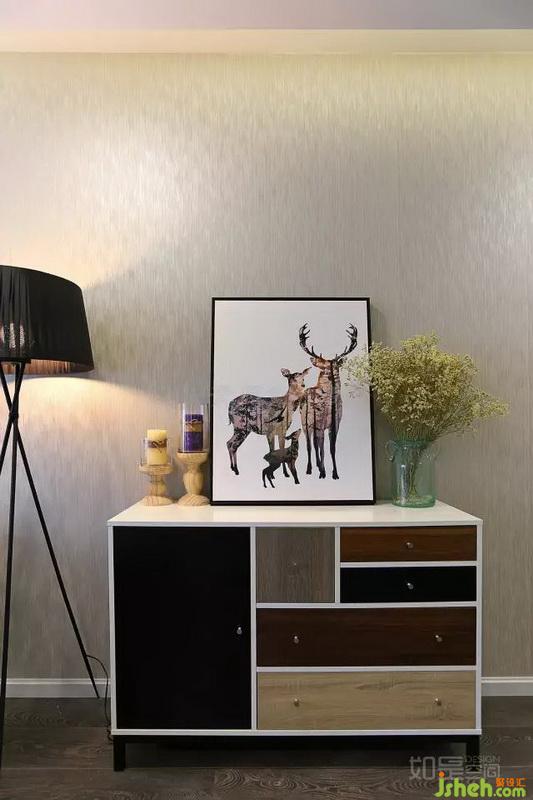 斗柜和落地?zé)舻姆胖?,可以讓入戶到沙發(fā)的距離感縮短,避免了通道顯得過長的缺陷。且斗柜和落地?zé)粜纬闪烁甙e(cuò)落的不對(duì)稱美。