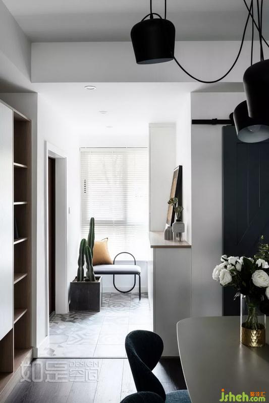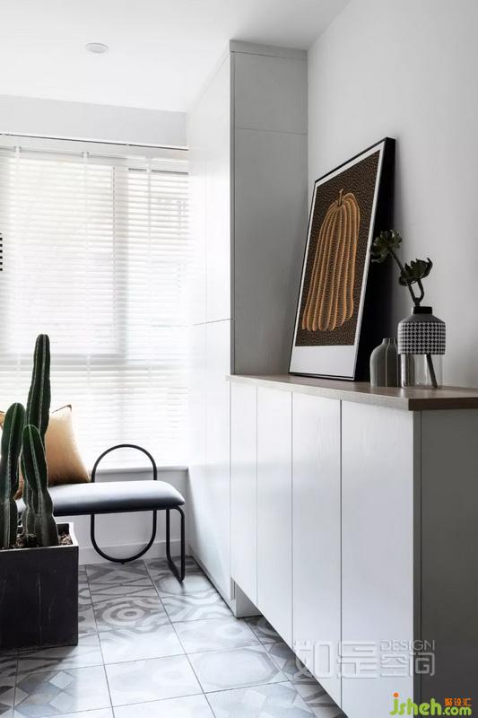 因入戶區(qū)較窄,室內(nèi)設(shè)計師只設(shè)計了一部分柜體到頂,靠近餐廳這邊則為半截柜。在滿足功能性的同時也化解了空間壓抑感