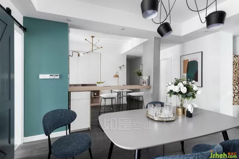 餐桌桌面室內設計師選用與餐廳茶幾同色同紋理的臺面,餐椅則選用了與休閑椅同色的深藍色,形成呼應