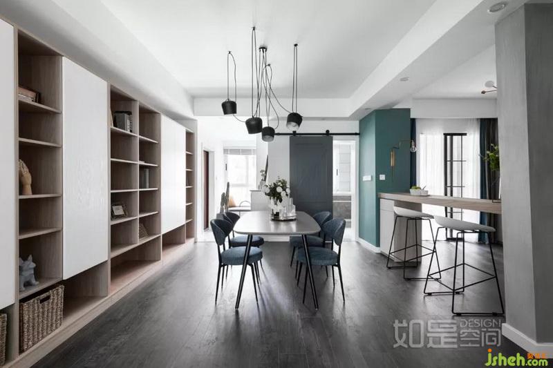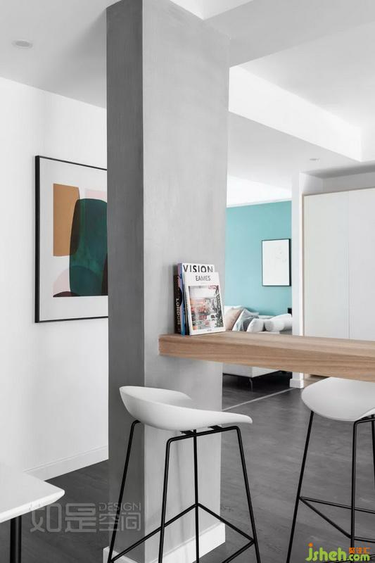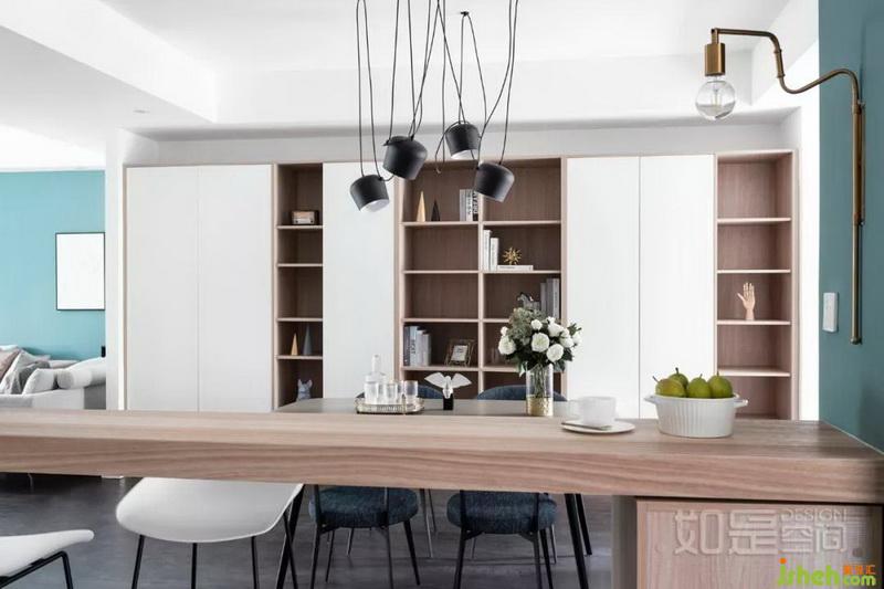 餐廳旁的過道很長,設計師在這里打造了一面局部開放的的儲物柜,解決了長期居住后的巨量收納需求,同時又顯得生動活潑。兼顧了美觀及實用性。