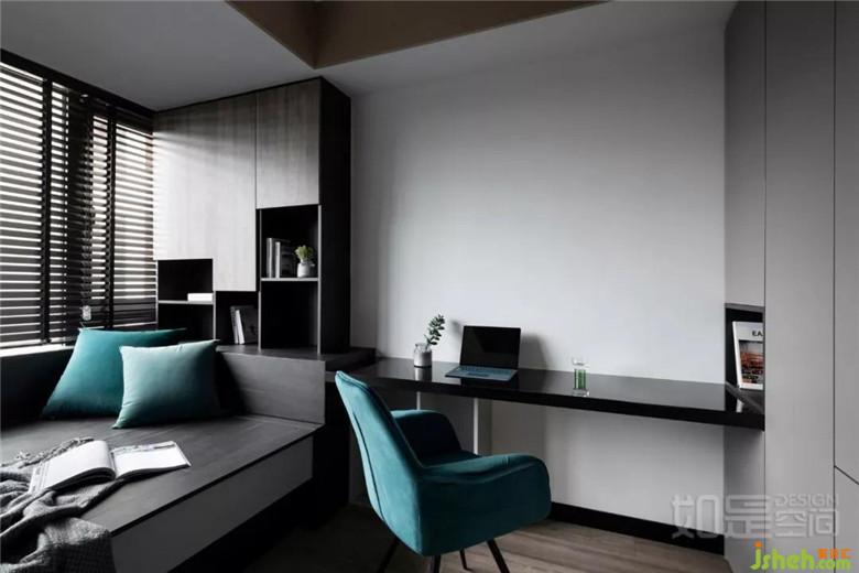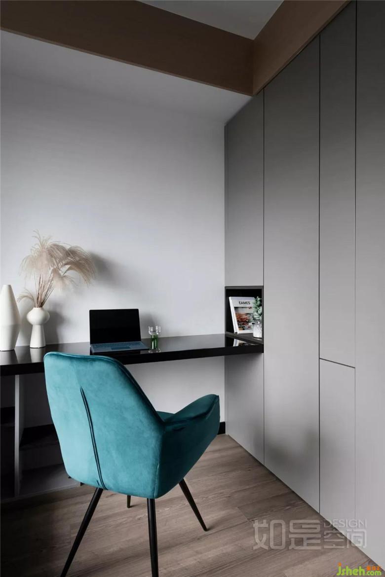 書桌與右邊衣柜巧妙結合一體,頗有新意,增加了空間利用率。大小不同的柜門則避免了生硬感。
