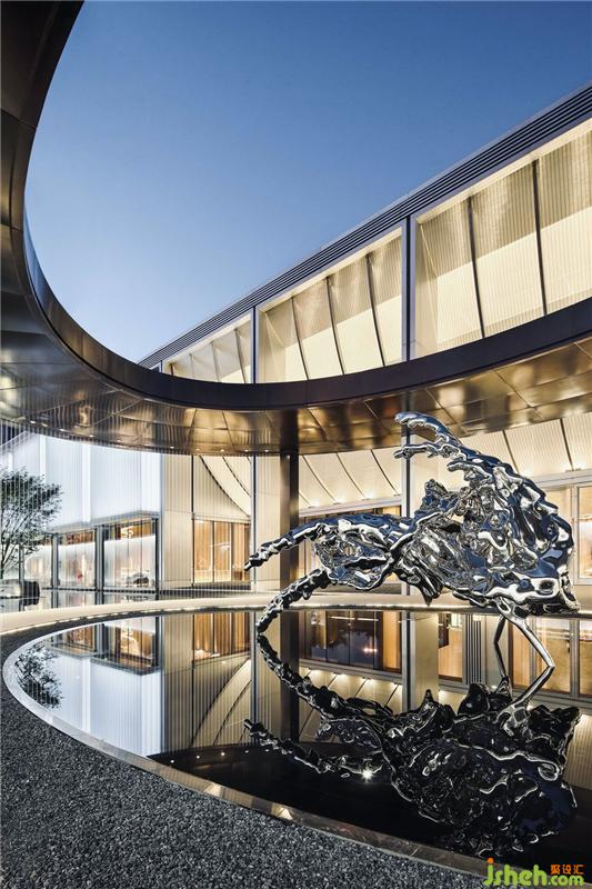 隨著參觀動(dòng)線層層遞進(jìn),津門故里的故事內(nèi)核慢慢展開。高墻大院營(yíng)造出曲徑通幽的園林意境,水滴雕塑形似天津海河入海定格凝聚的一瞬間。大面積的水域托襯出建筑的光澤,將邊界模糊至海天相接處那看似分明卻觸碰不到的視覺消失點(diǎn)上。