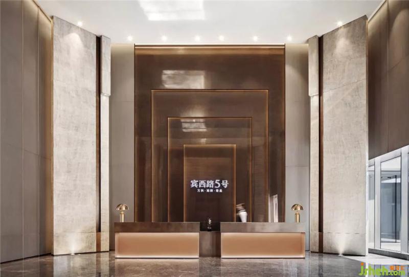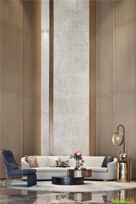 頂部及立面四周的通高石材形成環(huán)繞感,讓人站在空間的每個(gè)角落都能感受到津門的存在。而接待處則通過精心布局石材的層次將視線引向縱深,兩側(cè)通頂?shù)拇箝T如張開的雙臂,提升了空間的整體調(diào)性以及美好寓意。