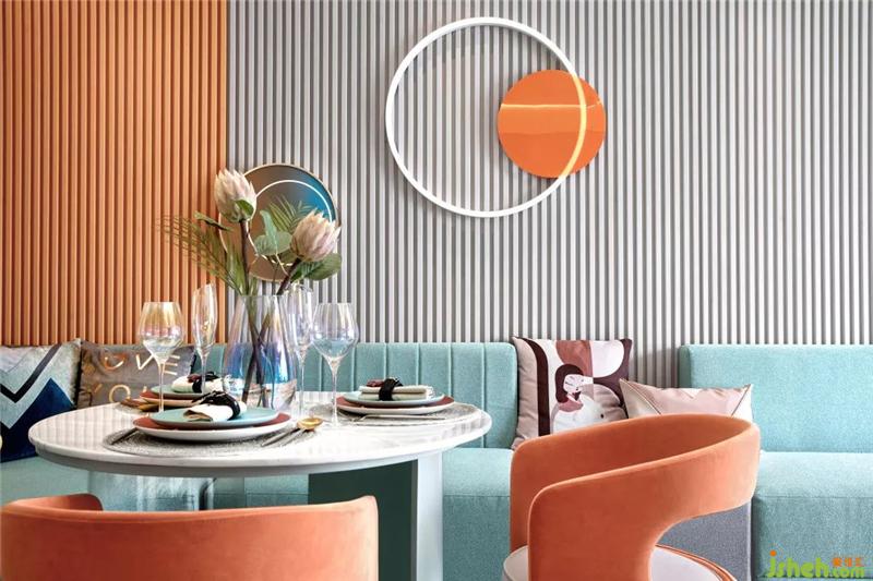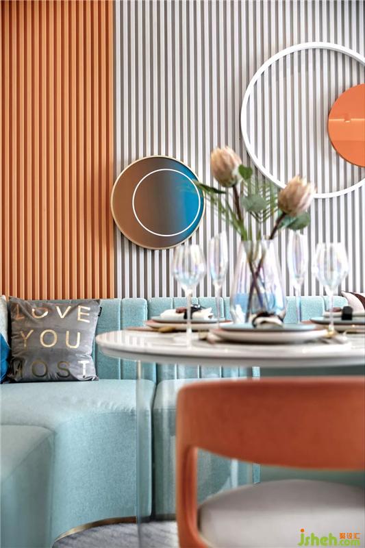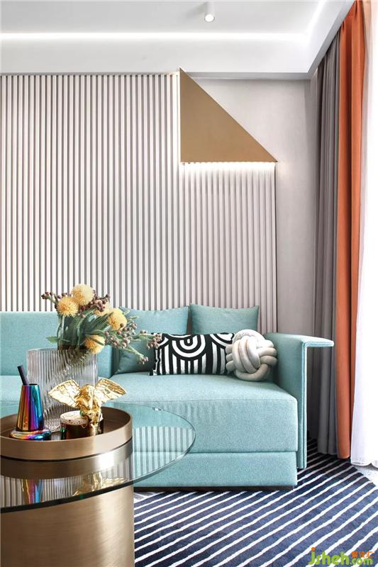 藍(lán)色的沙發(fā),清新而又出挑,讓整個空間更加廣闊,更有一眼就望見更多美好的可能。因橙色的點綴而更具生機,不需要鋪滿整個房間,只要一小色塊的躍動,便能為家?guī)硇迈r活力讓家在矜持和熱情中游走。它就像是還帶著香氣的新鮮橙果,充滿陽光的活力,又像是鮮榨的橙汁,給予你一天的精力。樣板房設(shè)計