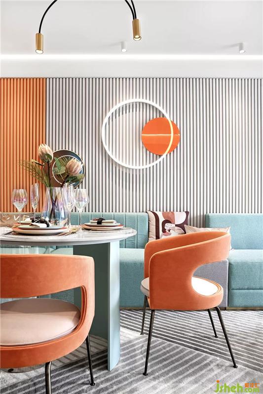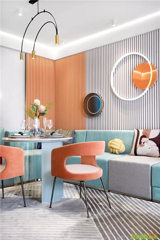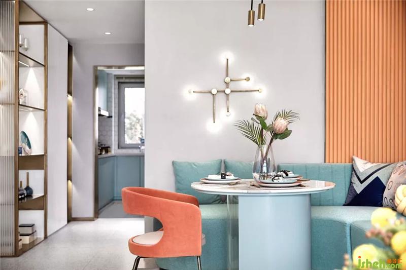 客餐區(qū)主色調(diào)為橙色和藍(lán)色,清新的色彩抓人眼球,加上星星點點的燈,簡約精致的桌椅,每一處都展現(xiàn)了餐廳特有的輕奢氛圍。馬卡龍色,靜謐自然、輕松愜意,通過色調(diào)和色溫的表達(dá),層層遞進(jìn)中,顏色的傳遞與物象的表達(dá),讓你擁有一刻安寧與靜謐的時光。樣板房設(shè)計