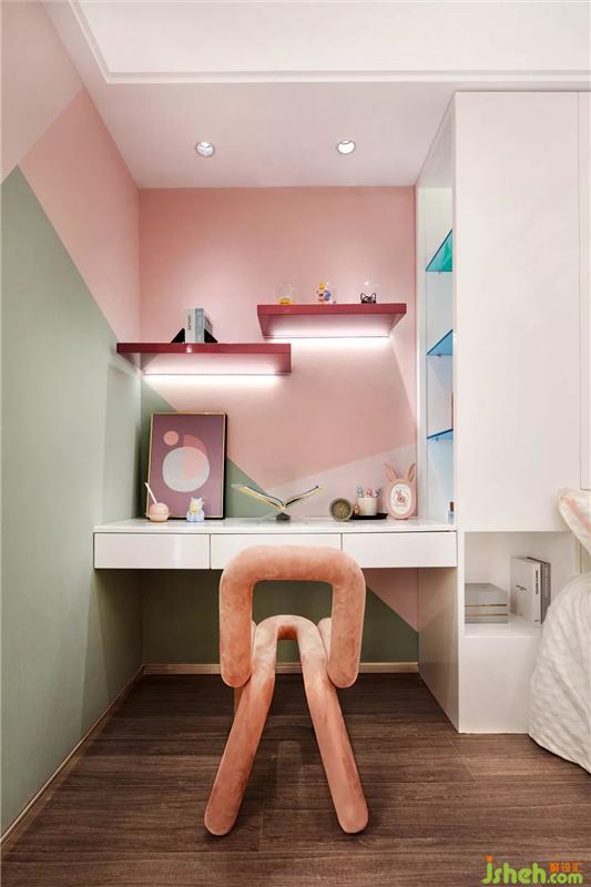 兒童房選用桃粉色為主色調(diào)搭配薄荷綠,墻面的色塊拼接是一種兼容的色彩手法,能夠把你喜歡的顏色統(tǒng)統(tǒng)“上墻”,以幾何圖案的形式呈現(xiàn)。居室中細(xì)膩浪漫的情懷撲面而來(lái),純凈的少女粉還可傳遞出,可愛甜美溫馨感。