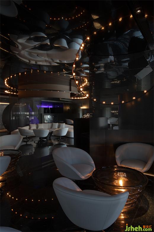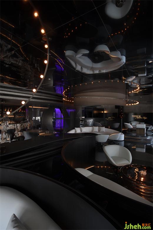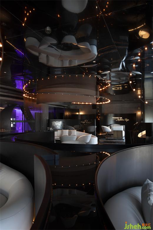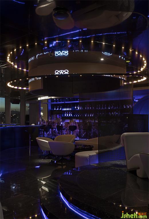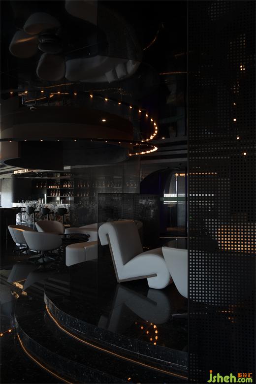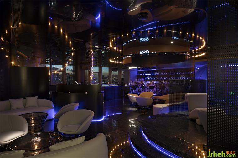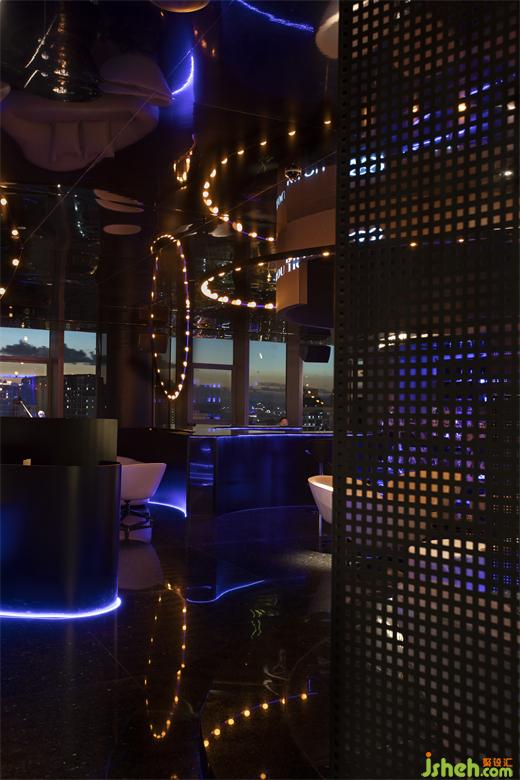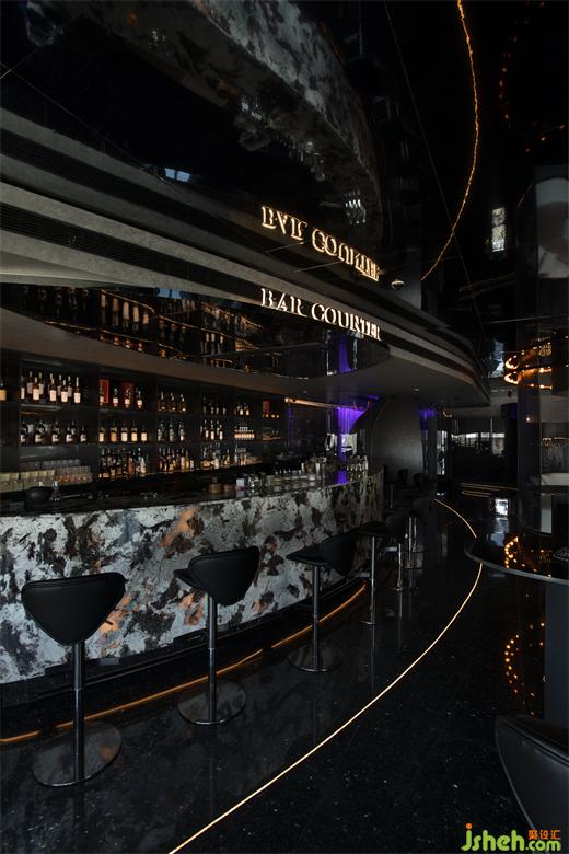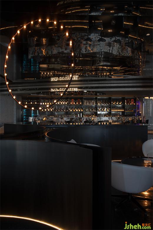 光,是我們對時間的基礎感知,環(huán)繞落地窗讓流動的時間呈現(xiàn)可視化,璀璨夜景盡收眼底,展開空間的敘事。高空酒吧設計環(huán)周有序分布的氛圍燈像正在運行的小行星,屋頂鏡面板拉長空間整體縱向感,賦予空中酒吧面向未知與神秘的寰宇視野,又或如同月光下的湖泊。