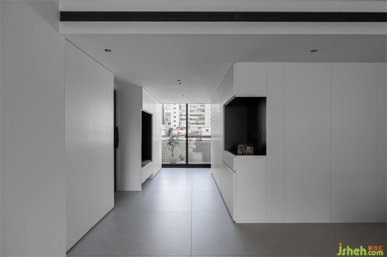 考量空間完整性并選用容易清潔的磁磚,因此玄關(guān)處并無(wú)特別設(shè)置落塵區(qū),僅以內(nèi)嵌穿鞋椅與大面儲(chǔ)物柜,奠定場(chǎng)域性質(zhì)。自穿鞋椅延伸至立面轉(zhuǎn)角的整面柜體,除了滿足現(xiàn)有置物需求,亦是因應(yīng)未來(lái)新增家庭成員所需,提供完善的收納機(jī)能。柜體門片不做手把,采用透芯材料,弱化板材上的鮮明黑線,并由此以純白語(yǔ)匯發(fā)展至天地壁,建構(gòu)統(tǒng)一利落視覺(jué)。
