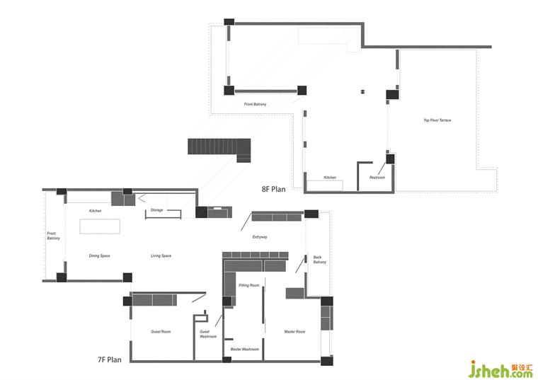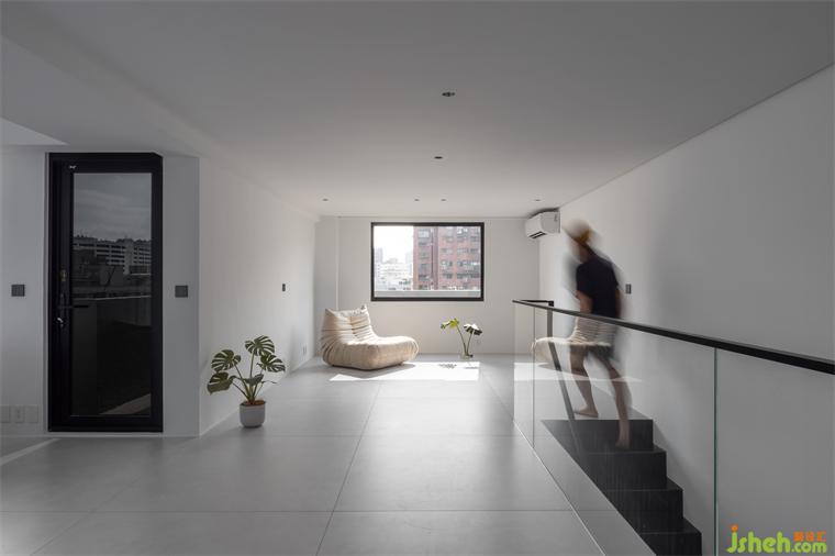 復(fù)式裝修設(shè)計(jì)得利于八樓充足的日光條件,在觀察陽(yáng)光照射?度及空氣對(duì)流狀態(tài)后,于北面露臺(tái)窗洞,劃設(shè)折疊氣密門,連接室內(nèi)外空間,亦有效放大視野。南面長(zhǎng)廊則規(guī)劃為辦公及瑜伽空間,當(dāng)需要深夜工作或進(jìn)行瑜伽冥想時(shí),得以僻一隅靜謐,與七樓的生活機(jī)能區(qū)隔開(kāi)來(lái)。