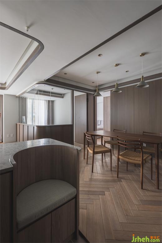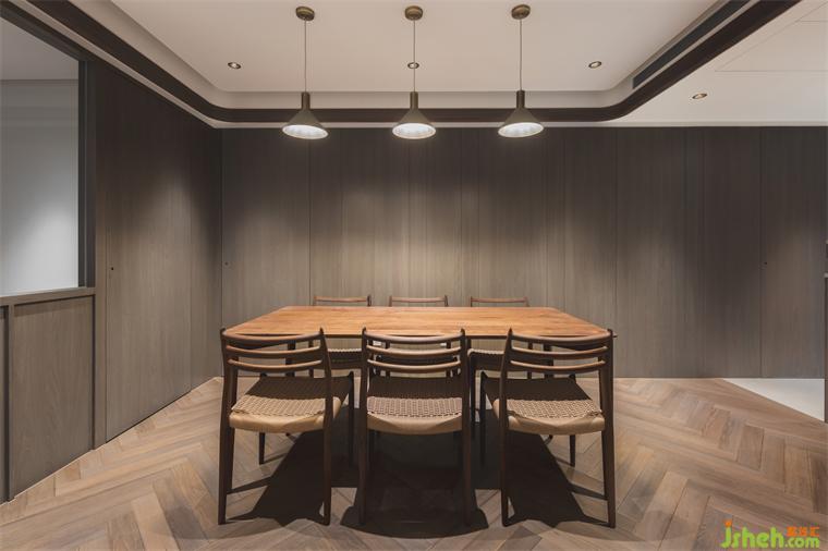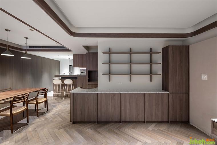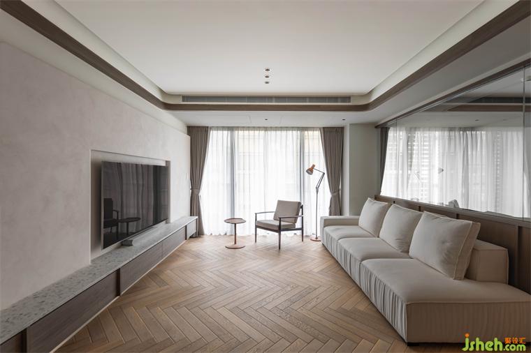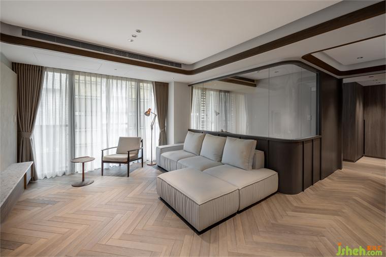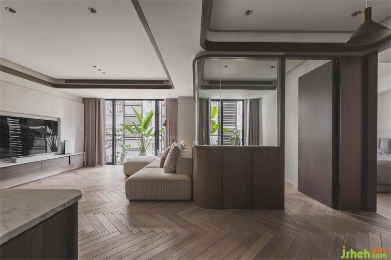 客廳天花板利用溝縫制造不同層次高度,同時定義場域性質,相偕人字拼地坪的漸進次序,大平層設計使視覺延展更添闊朗,此一概念延續(xù)至書房、餐廳,建立整體空間的一致性。