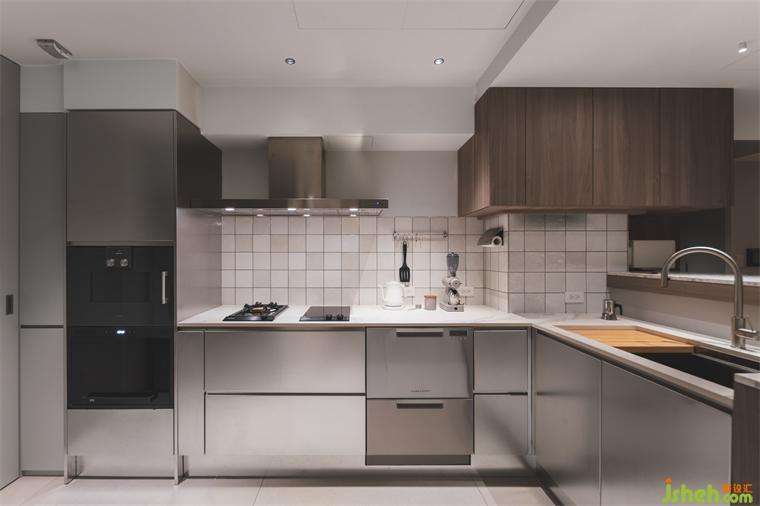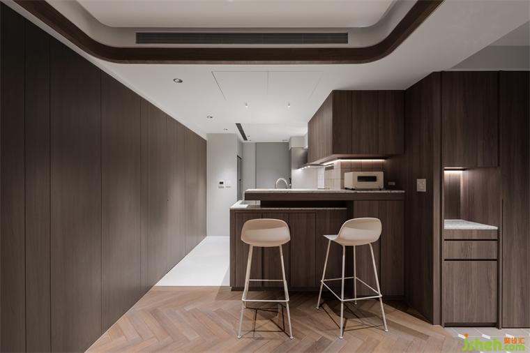 餐廳與廚房過道處,以相異材質地坪,喻示空間轉換,并劃設一轉角吧臺,讓視線得以穿透,分而不隔建立對話平臺,方便女主人在料理時亦能關照家人。我們將廚具配置設定為L型動線,方便完成備料、烹煮等所有動作,也能一眼望見所需,依據(jù)置放邏輯,井然有序的完成料理。
