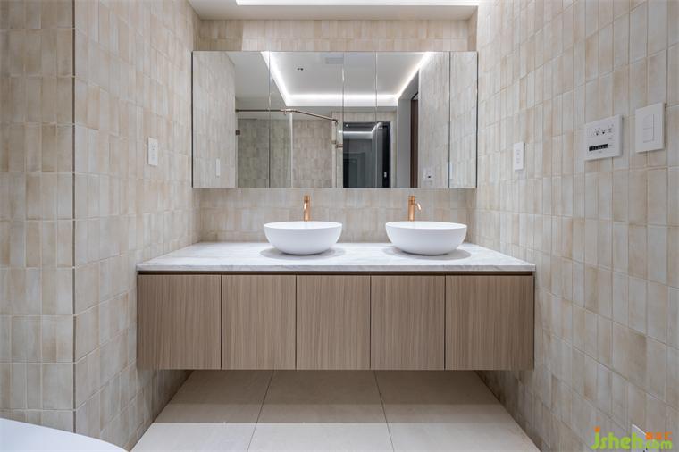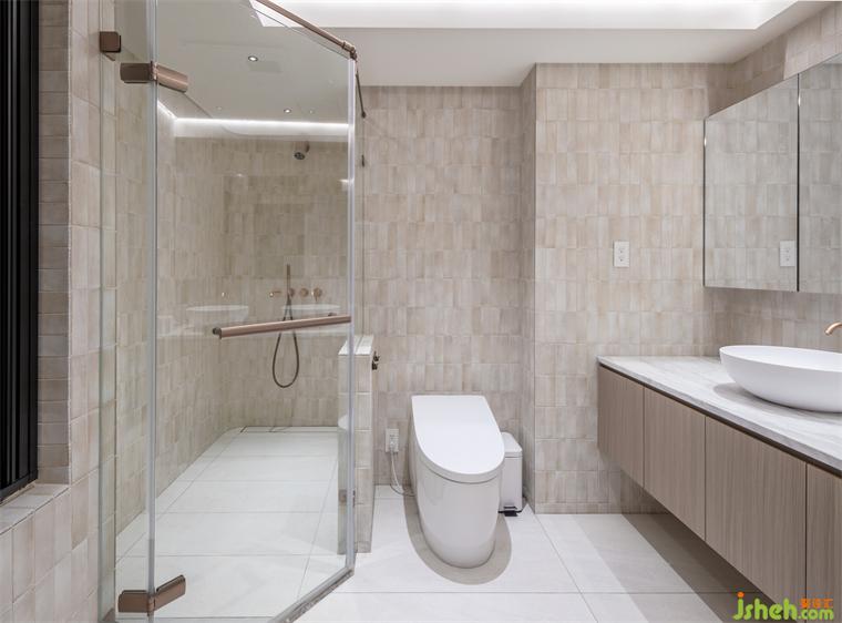 有別于客浴,此區(qū)使用米黃色系的自然窯變磚,以烘烤上釉方式描繪自然肌理,搭配古銅金屬配件,典雅細(xì)致盡顯細(xì)部質(zhì)感。