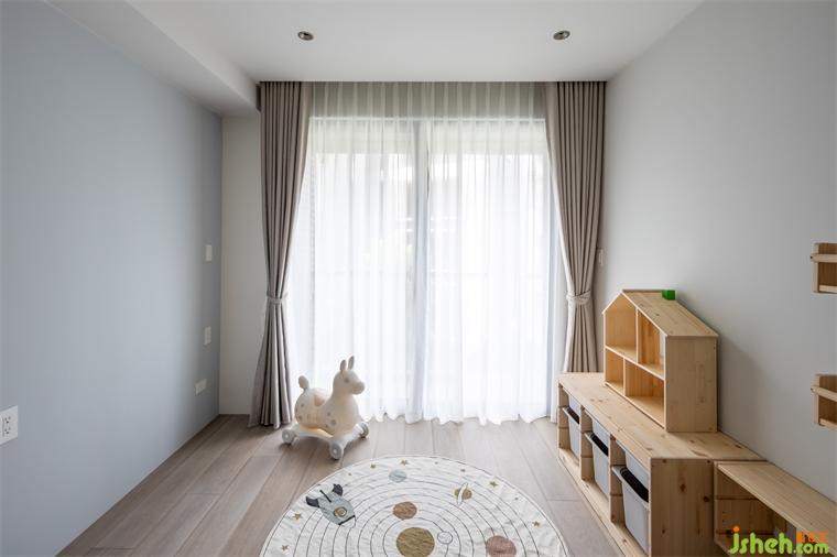 因小孩處幼齡時期,因此空間規(guī)劃上,以開闊舒適為旨,避免磕碰受傷,不采用固定家具配置,而以活動式柜體,簡單劃設(shè)未來床鋪與書桌擺放區(qū)域,方便因應(yīng)成長階段的不同需求彈性調(diào)整??剂坑變憾嘤诘孛媾佬?,設(shè)置嵌燈會使視角炫光感嚴(yán)重,因而改以間接照明,減少對幼兒視線的影響。