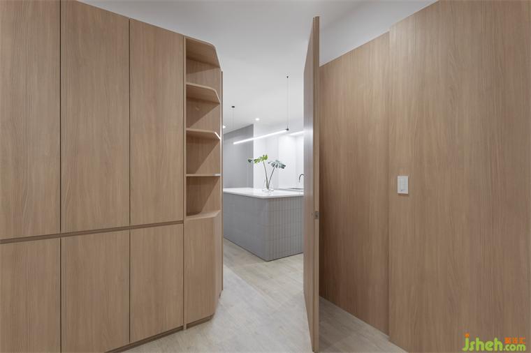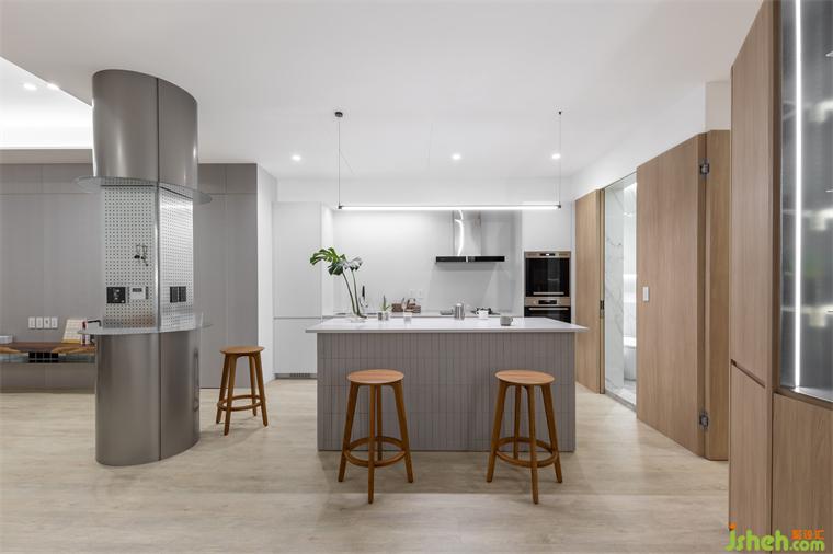 相對(duì)于客餐廳的留空處理,廚房機(jī)能相對(duì)完善,住宅設(shè)計(jì)以因應(yīng)各種情境需求,不論是做為住宅、招待所亦或拍片場(chǎng)景,都能詮釋空間的使用彈性。在此我們也做了大片留白,僅以鋸齒狀立體磚呈現(xiàn)變化,冰箱及家電設(shè)備采取嵌入式設(shè)定,紅酒柜亦埋入中島,以保有整體視覺(jué)的利落齊整。