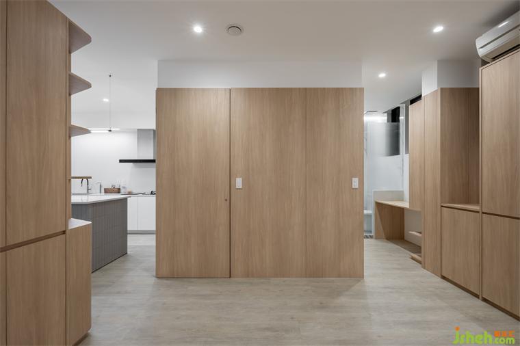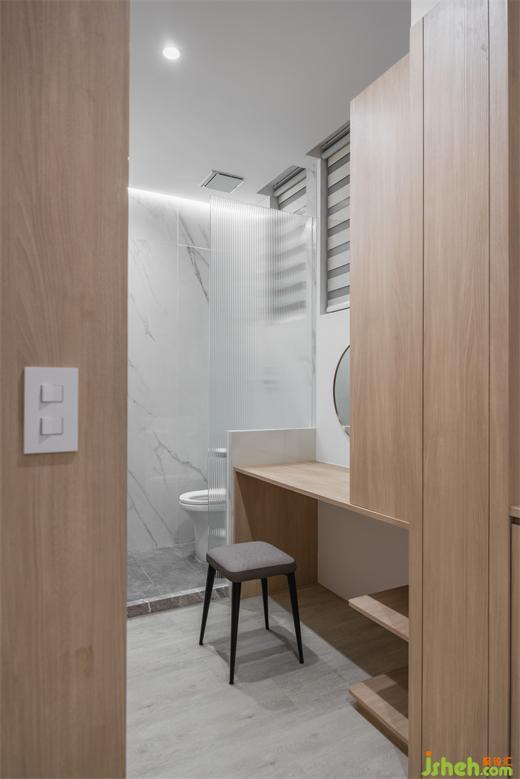 因衛(wèi)浴位置為固定不可移動(dòng),因此我們爭(zhēng)取主臥空間向外推,并賦予大量收納機(jī)能,定義空間量體,水平與垂直線(xiàn)條連貫對(duì)應(yīng),建立視覺(jué)秩序。另劃設(shè)簡(jiǎn)易化妝臺(tái)與小便間,供影片拍攝或休憩使用,平時(shí)門(mén)片為敞開(kāi)式,整面木質(zhì)語(yǔ)匯和公領(lǐng)域空間相互串連,隔而不分、界而未界。