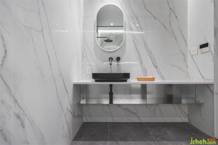 因應(yīng)公私領(lǐng)域大面積的金質(zhì)與木質(zhì)調(diào),業(yè)主希望局部區(qū)域能采用清淺石紋,于是我們?cè)谛l(wèi)浴濕區(qū)及主臥廁所、小便間,都選用大理石紋呈現(xiàn),住宅設(shè)計(jì)立面則鋪以防水性能良好的晶石板材,同時(shí)屬零醛添加的綠色材料,兼顧安全、環(huán)保與實(shí)惠效益。