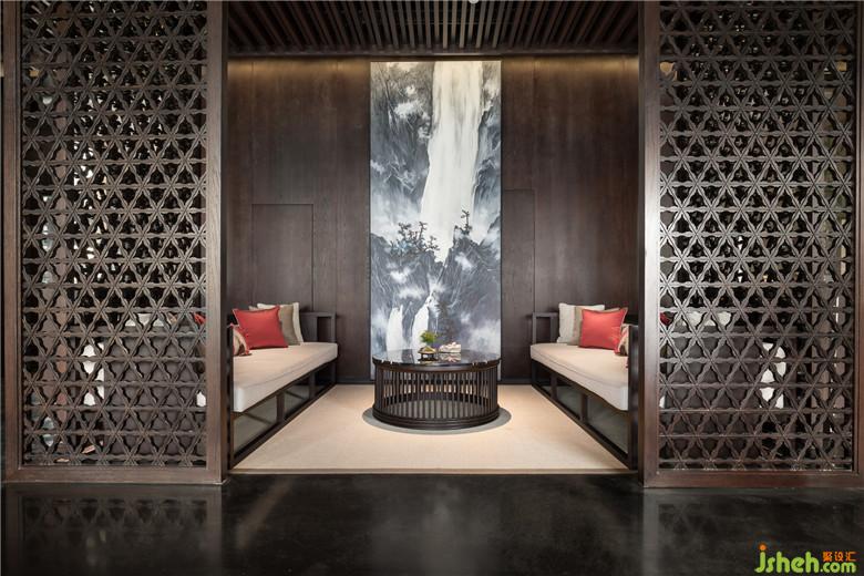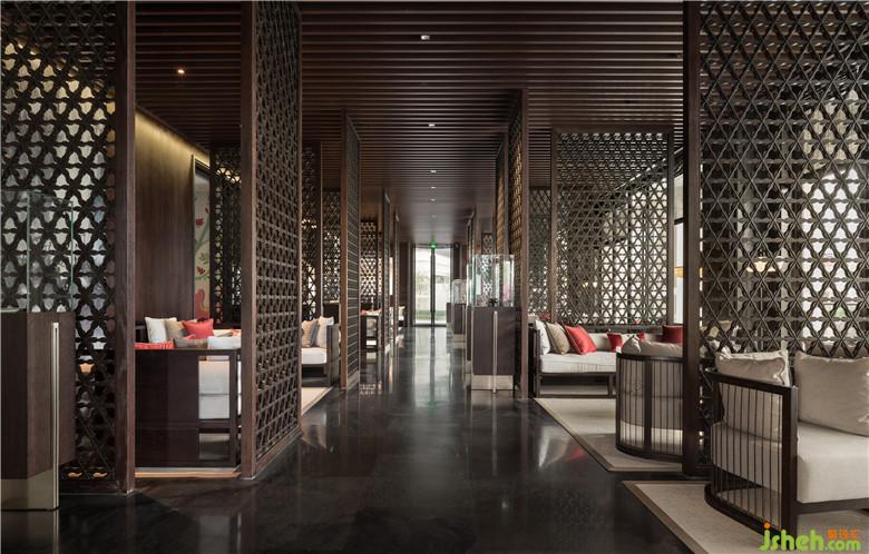 銷售中心提取中式傳統(tǒng)元素“木花格”,結(jié)合當代建筑形態(tài),將深褐色的“木花格”拼接成大小不一的屏風、圍欄等作為空間隔斷,營造出通透開放的大格局,統(tǒng)一了恢弘雅致的整體基調(diào)。裝修公司