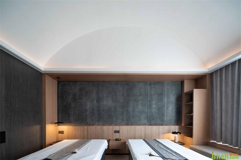 2人SPA包廂帶島型獨立浴缸,梳洗空間與按摩休息室以木門半隔,邊界模糊。會館設(shè)計懸山頂?shù)奈蓓斣诖碎g露出,極大地減少了島型浴缸帶來的曖昧感,卻留出十足放逸。按摩床所在的休息室落回寧靜收斂之氣,2人間也因屋頂之高不顯局促,從頂部垂下的燈盞給空間增加了纖細穩(wěn)定之美。