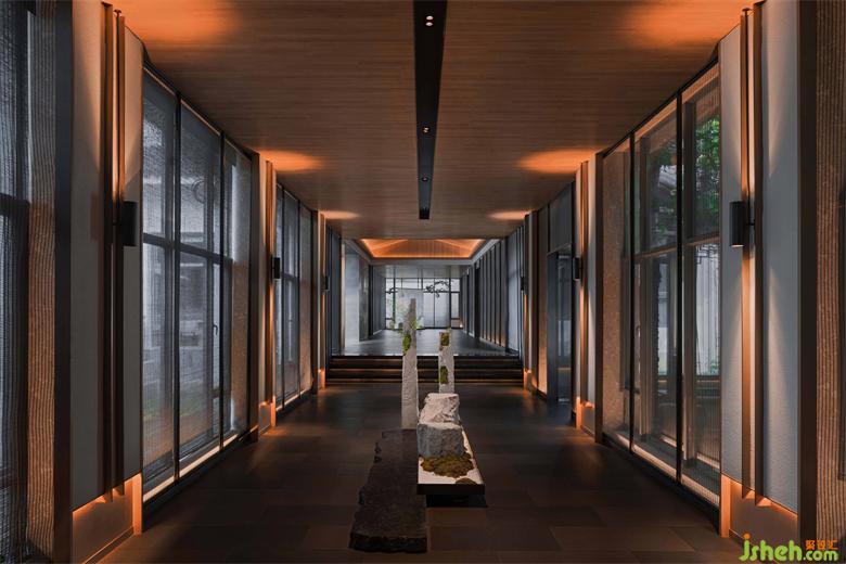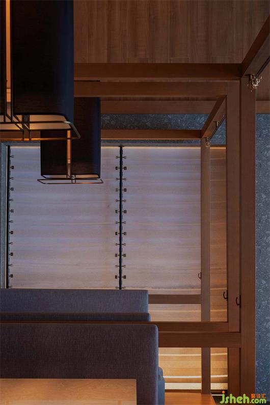 金屬簾、原木、原石、足夠的室內(nèi)留白和浮光掠影,讓空間生出類似侘寂之美,但此間疏朗曠達,絕無殘落之意。人行其中如置身煙波河流,雖浸霧靄朦朦,猶沐燈火融融,心存彼岸,無有厭離,清歡常伴。