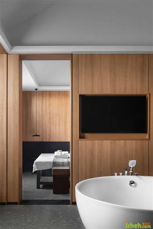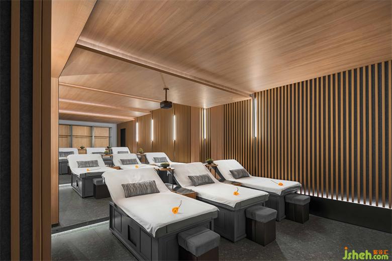 除此之外,養(yǎng)生館內(nèi)還配有9人間的足浴影音室,室內(nèi)分為三階,側(cè)立面飾以大面積木柵欄,整體感覺(jué)像一個(gè)小型電影院。