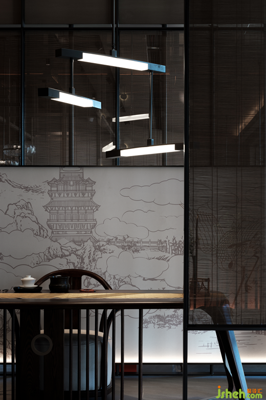 臻品的一側(cè),以連綿不斷的隔斷為畫布,將揚州的經(jīng)典地標建筑以繪畫的形式展現(xiàn)出來,宛如一幅宋代江南茶社畫卷,如同行云流水般的移步易境。