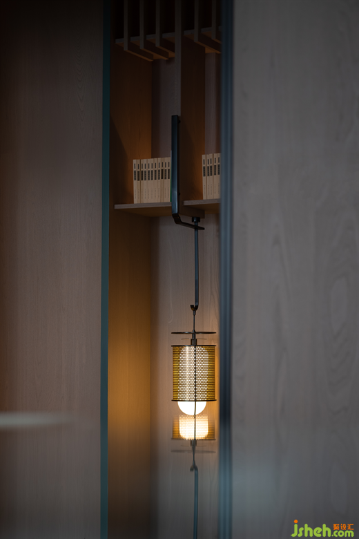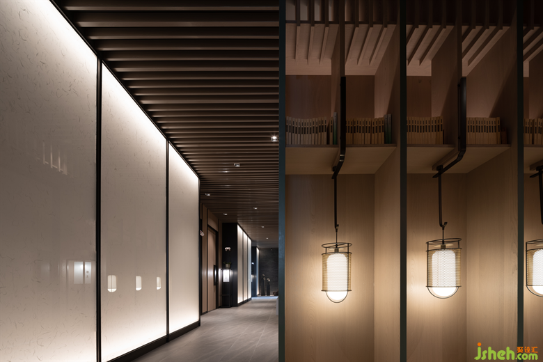 “幾百年人家無非積善,第一等好事只是讀書”,針對書香揚州,設(shè)計師在二樓包廂走廊空間精心設(shè)置了連門書架,銅色的精致燈具放置其中,顧客需要推開一側(cè)穿插“書架”中書卷氣息的門扇方能進入包廂中。另一側(cè)藏在和紙中的包廂仿佛置身于朦朧霧氣之中,更有一種江南之美。