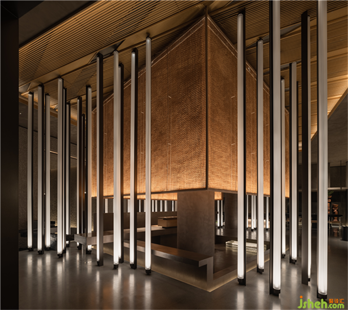在本案宜興和子SPA會館中,因宜興多山水竹林,和子SPA會館設(shè)計設(shè)計師范日橋以被稱為「宋畫第一」的《溪山行旅圖》為靈感,通過反復抽象,直化 SPA 會館五層樓宇為「山」,中通「峽谷」,內(nèi)植「竹林」,戲「水」安「亭」,將《溪山行旅圖》揉入樓宇骨架,成為其底層文化邏輯。又借切換山林場景的手法,獲得空間內(nèi)外不停反轉(zhuǎn)的錯離體驗,喚起人們獲得塵世抽離的觀感,進而豐滿空間體驗。