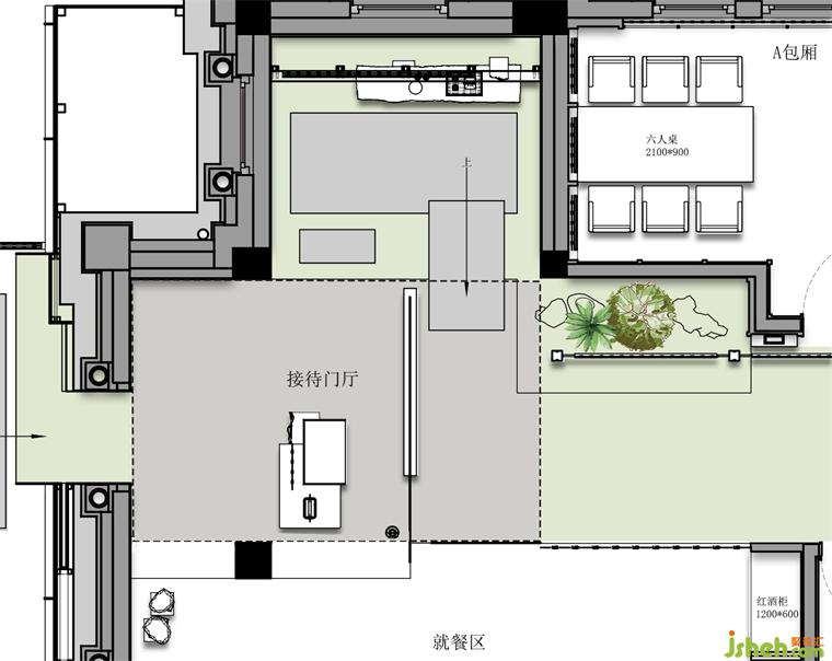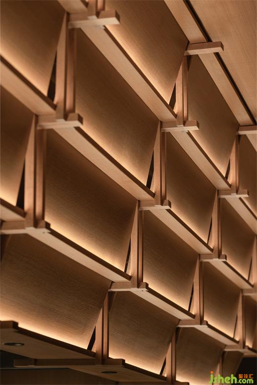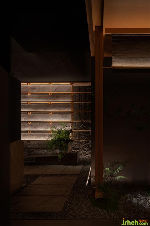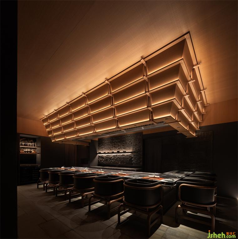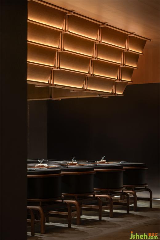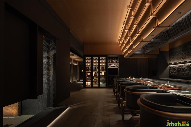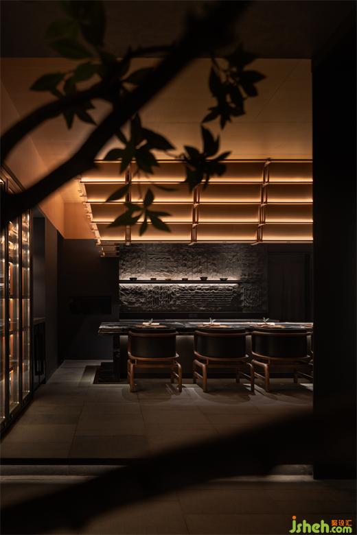 松聲靜夜聞,月光涵露重。空間欲揚先抑,素黑幽玄的環(huán)境中包含著對自然的敬意和縮影,雪松、巖石、明月,如在筆墨間。日料餐廳設(shè)計建筑并未寓意過多,沉寂幽玄的光影帶來的克制讓觀者將悲喜收于內(nèi),卻也牽出夢的絲線,掛于松雪之末,月隱婆娑處。