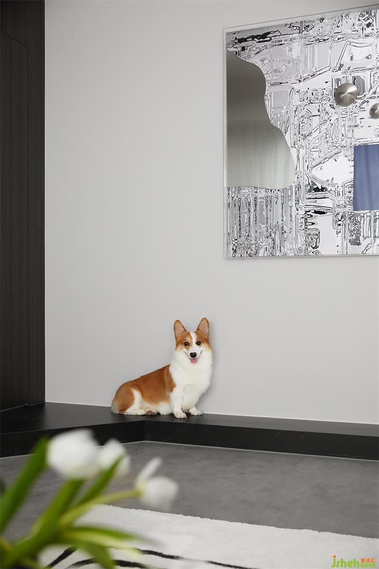 樓梯與客廳隔墻上的鏤空時鐘圖形,削弱了整面白墻的單調(diào)性,家裝設(shè)計增加了空間趣味,同時使樓梯與客廳擁有互動性,豐富居住者的體驗感。