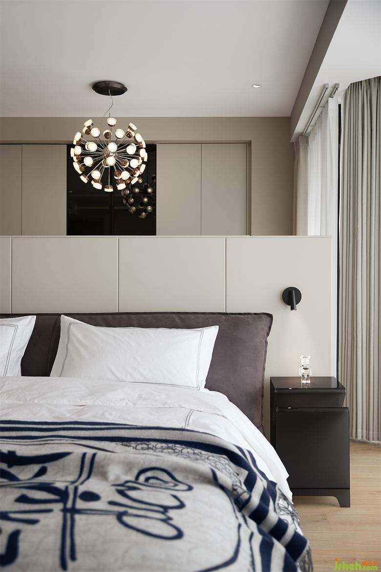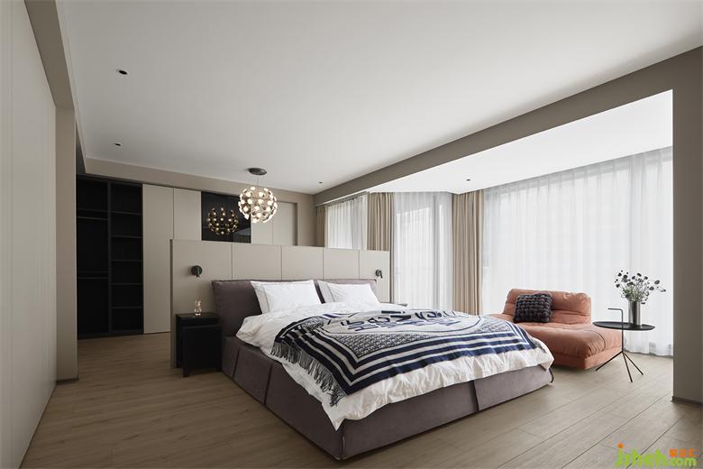 主臥室內(nèi)運(yùn)用莫蘭迪色系,氤氳出愜意舒緩的休憩氛圍。在空間布局上,家裝設(shè)計(jì)師用一面矮墻來劃分衣帽間與睡眠區(qū),打造出一個雙動線的開放式衣帽間,與睡眠區(qū)連通貫穿,打破了臥室的傳統(tǒng)布局思路,讓空間動線更為流暢,兼?zhèn)涔δ苄耘c美觀度。