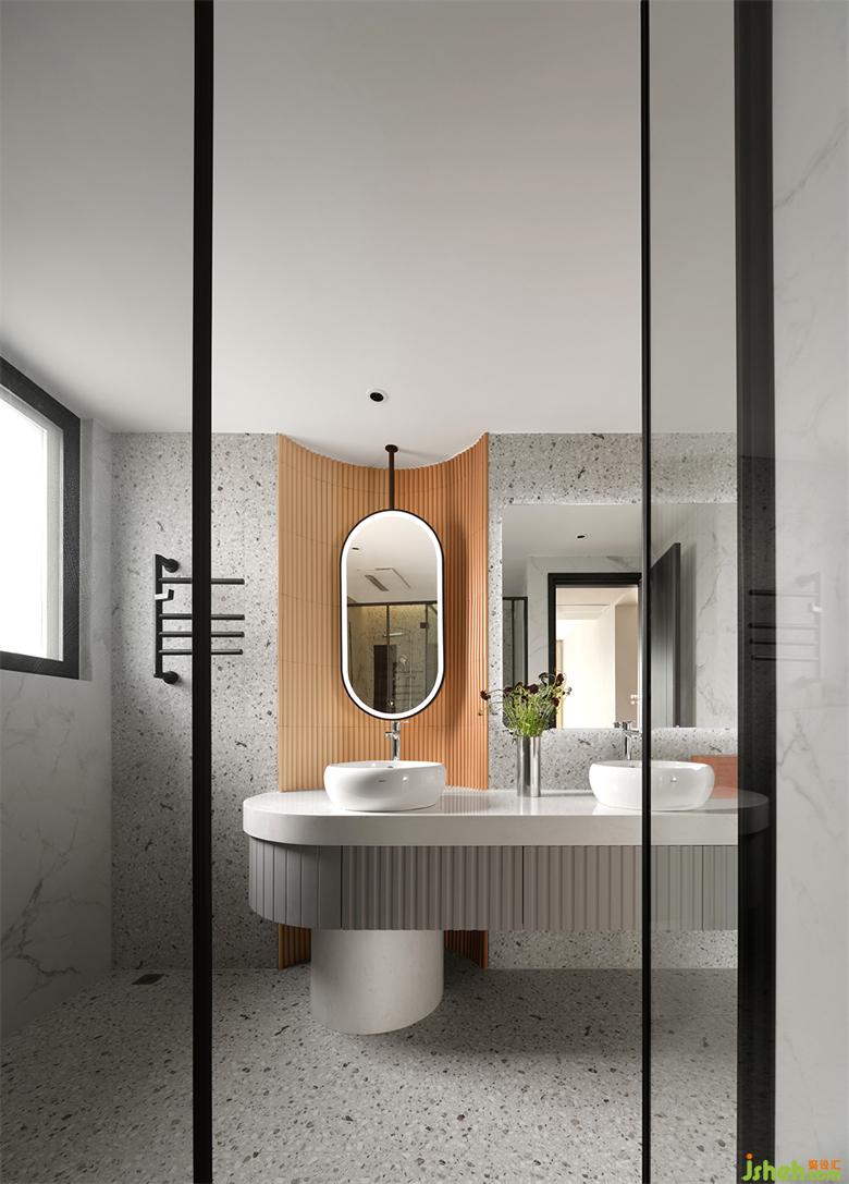 盥洗區(qū)、馬桶區(qū)和淋浴區(qū)三分離衛(wèi)生間提升空間實(shí)用性,每個功能相互獨(dú)立,互不打擾。家裝設(shè)計(jì)師在盥洗臺延用曲線元素,與公共空間的線條運(yùn)用相呼應(yīng),打造出一個干凈清爽且富有藝術(shù)美感的洗漱環(huán)境。