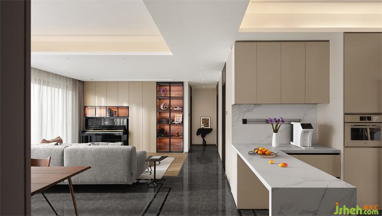 開放的西廚區(qū)域與餐廳相對(duì),同時(shí)與右側(cè)中廚連接,家裝設(shè)計(jì)形成流暢的洄游動(dòng)線。中西廚俱全的布局,能夠滿足業(yè)主日常制作美食的需求。