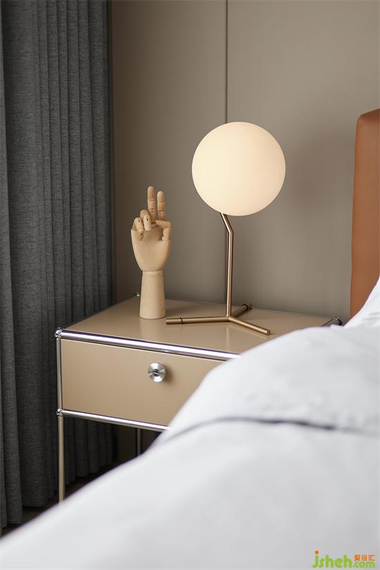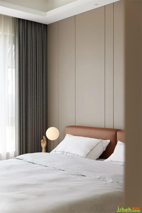 主臥以暖色為基調(diào),硬包床頭背景墻和焦糖色床體相互映襯,豐盈著空間色彩層次,家裝設(shè)計(jì)營(yíng)造出柔和舒緩的休憩環(huán)境。