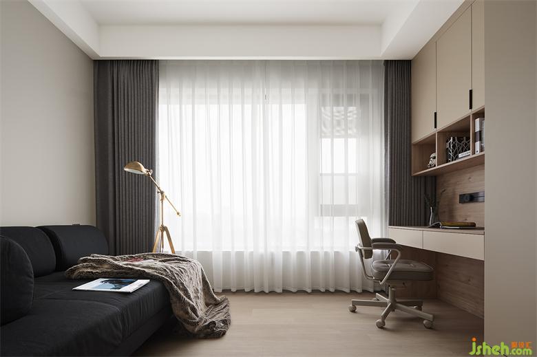 書房簡潔有序,深色沙發(fā)為空間注入理性的沉穩(wěn)感。書桌收納柜一體化,給室內(nèi)預(yù)留出自由的活動空間,家裝設(shè)計讓空間擁有更多可變性,滿足業(yè)主不同居住階段的使用需求。
