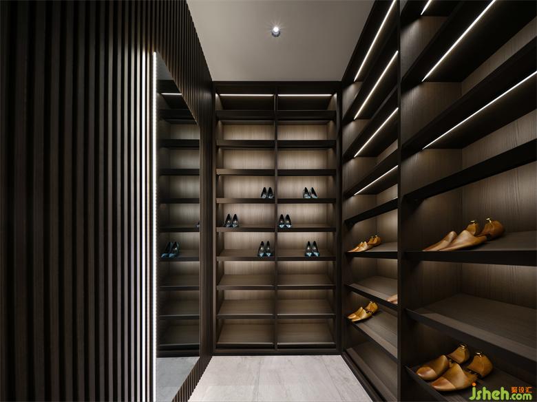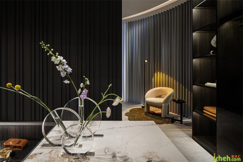 衣帽間在落日燈的斜輝下顯得靜謐而氛圍感十足,簡約柔和的沙發(fā),中和了洗練線條的硬朗,在豐富的光影里,展廳設計空間也被烘托得極具層次感。